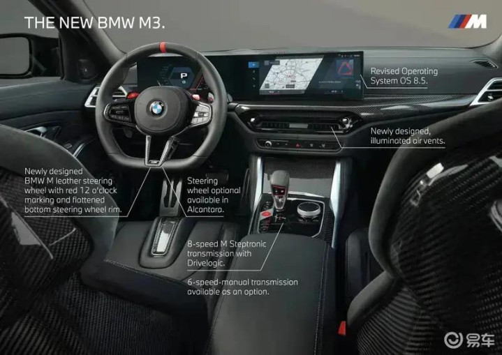 内饰方面,新车采用了全新设计的多功能方向盘,同时配备搭载iDrive8.5车机系统的曲面双联屏设计,而电子换挡机构保留了经典的鸡腿档把,保留了M车型的运动属性。
